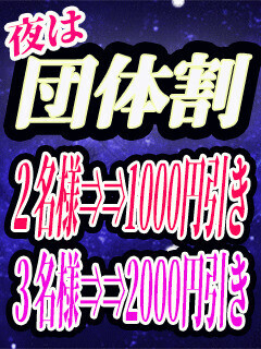 夜は団体割!!19時以降は二名様以上の連れ痴漢がお得!オールコース1000円割引!ご予約ももちろん無料です♪3名様以上でのご来店ならさらに1000円割引!