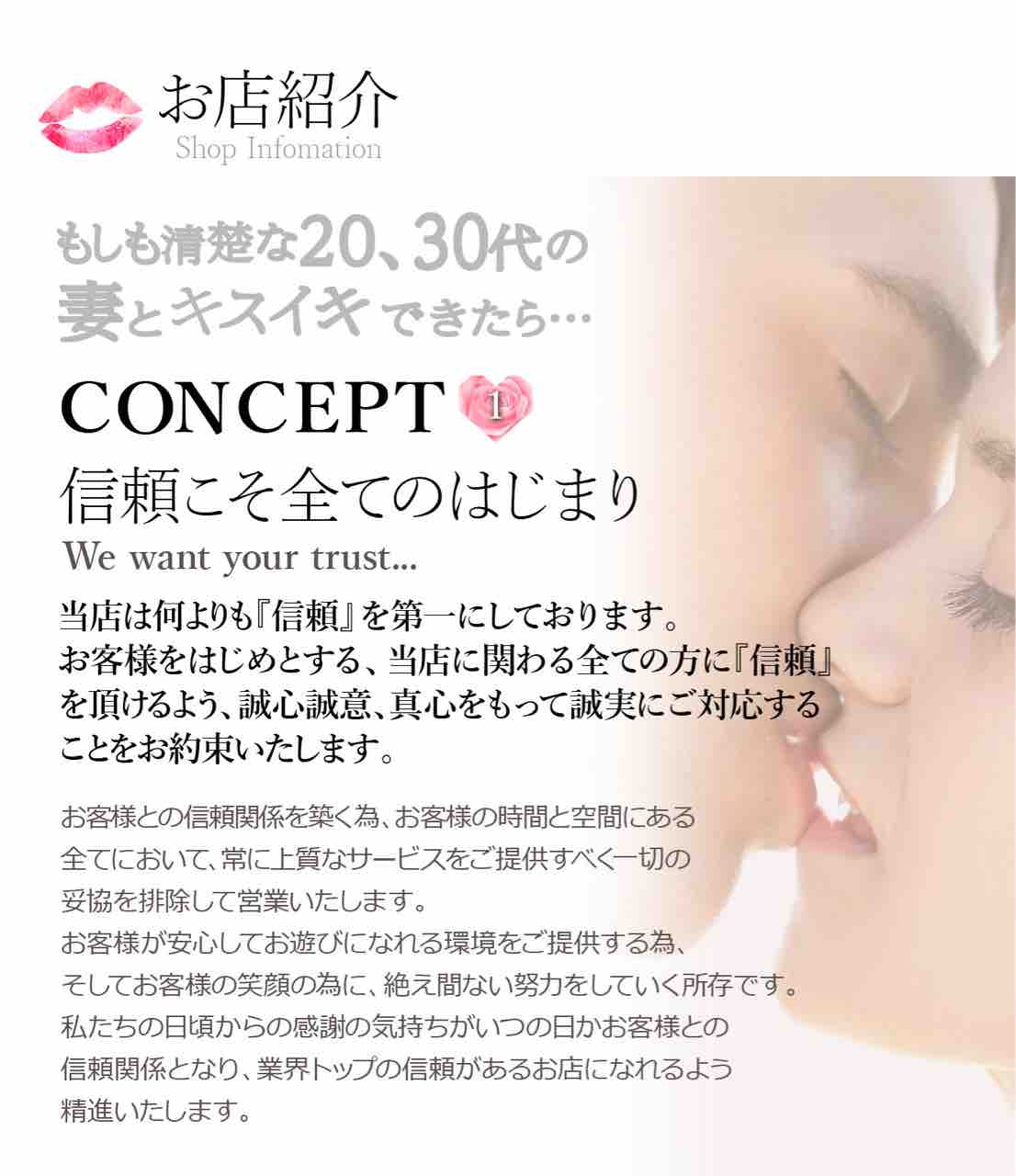 このふたつに重きを置いたヘルスで、目隠しキスから始まる独自コンセプトが特徴です。