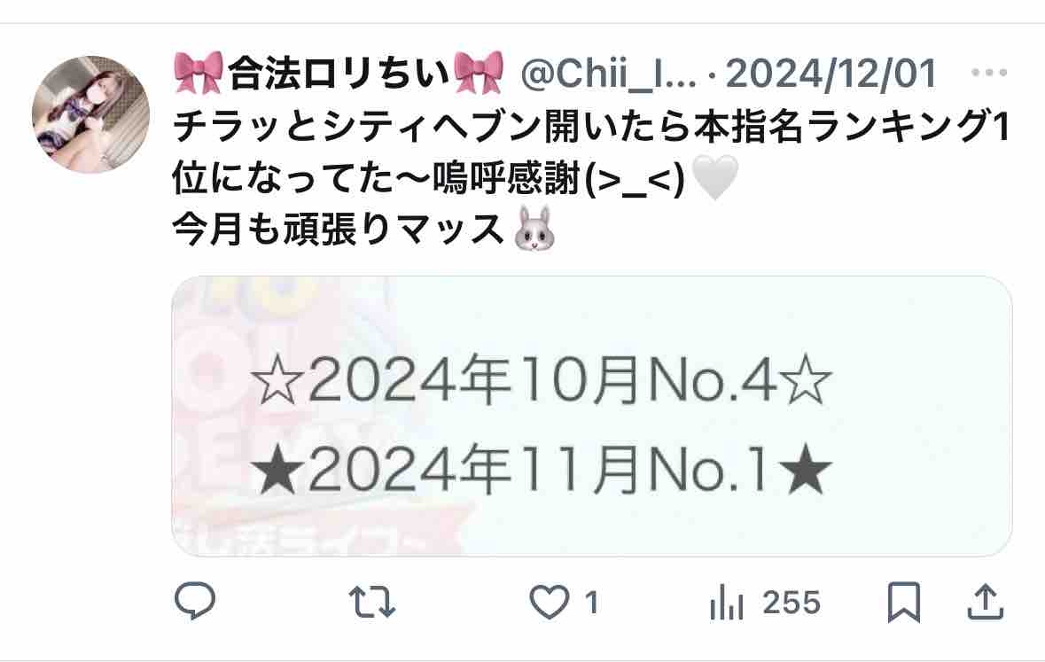 ちいさんのXを見てみると、1日で1,000アクセスを超えていたり本指名ランキング1位だったりと半端ない結果を出されている模様。