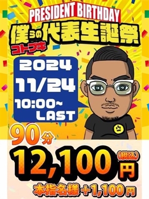 11月24日(日)限定イベント開催! コトブキ代表『誕生祭』 90分12,100円 120分20,900円 本指名+1,100円 今年も開催しちゃいます! あのジャパンカップをも超えるスペシャルイベント♪ そして、本指名のお客様も対応している貴重なイベントです。 お電話お待ちしておりましておりますm(__)m