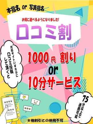 口コミを書くだけで、誰でも1000円割引or10分サービス♪♪